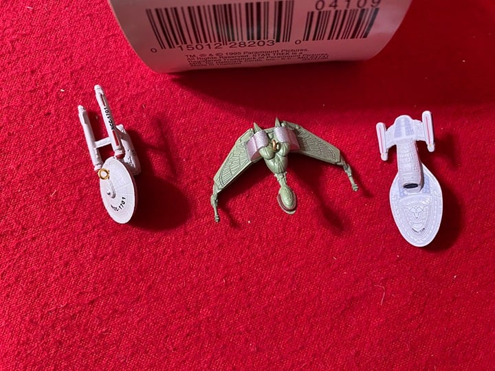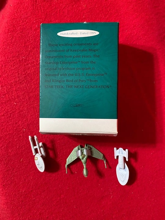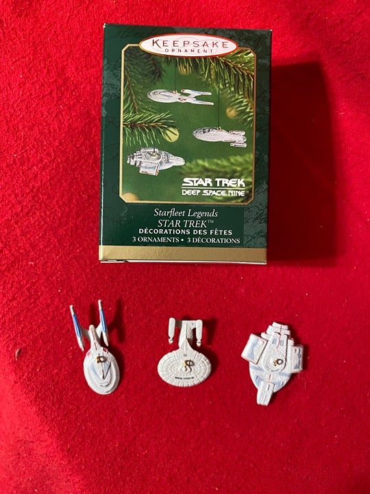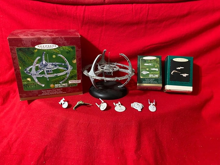 This Star Trek Hallmark ornament 3pc lot consists of: (1) Deep Space Nine Space Station ornament with display stand. It is battery operated with sounds & lights. It is dated 2001 and is in the original box, (2) Deep Space Nine Starfleet Legends 3pc ships. It is dated 2001 and is in the original box and (3) The Ships of Star Trek 3pc lot. It is dated 1995 and is in the original box. There are 6 miniature ships in all and they all can be docked on the space station as seen in the pictures. There are 3 different sets in this lot with boxes. They are in excellent condition.