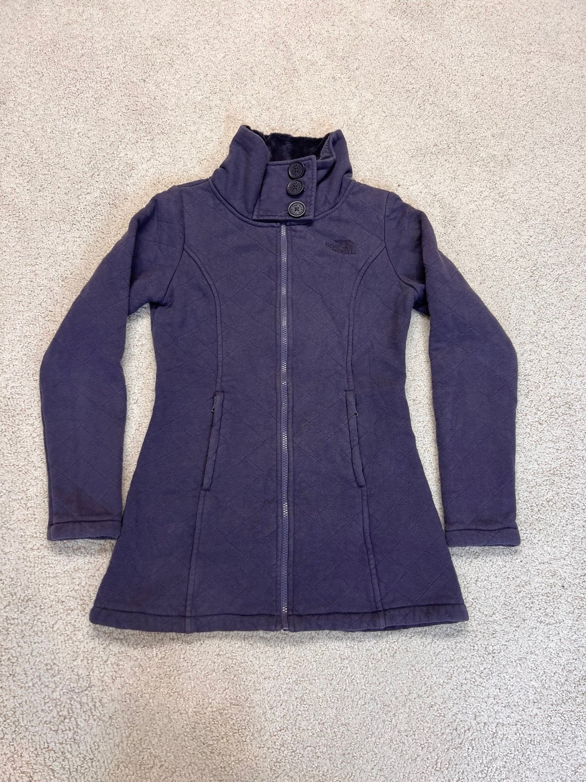 The North Face classic women’s quilted jacket in size XS, Fall 2014 style. Beautiful deep purple color with a fitted silhouette, high funnel neck with button detail, full zip front, and two front zip pockets. Soft fleece lining provides warmth and comfort, while the diamond quilted exterior adds style and durability, measurements shown in pictures, super cute comfortable and trendy, Perfect for school college gym exercise work office teacher vacation cruise outdoors hiking walking running wedding shower party graduation holidays casual or dress up concert beach rodeo summer winter fall dance casual wear, travel, or outdoor adventures. Timeless quality from The North Face.