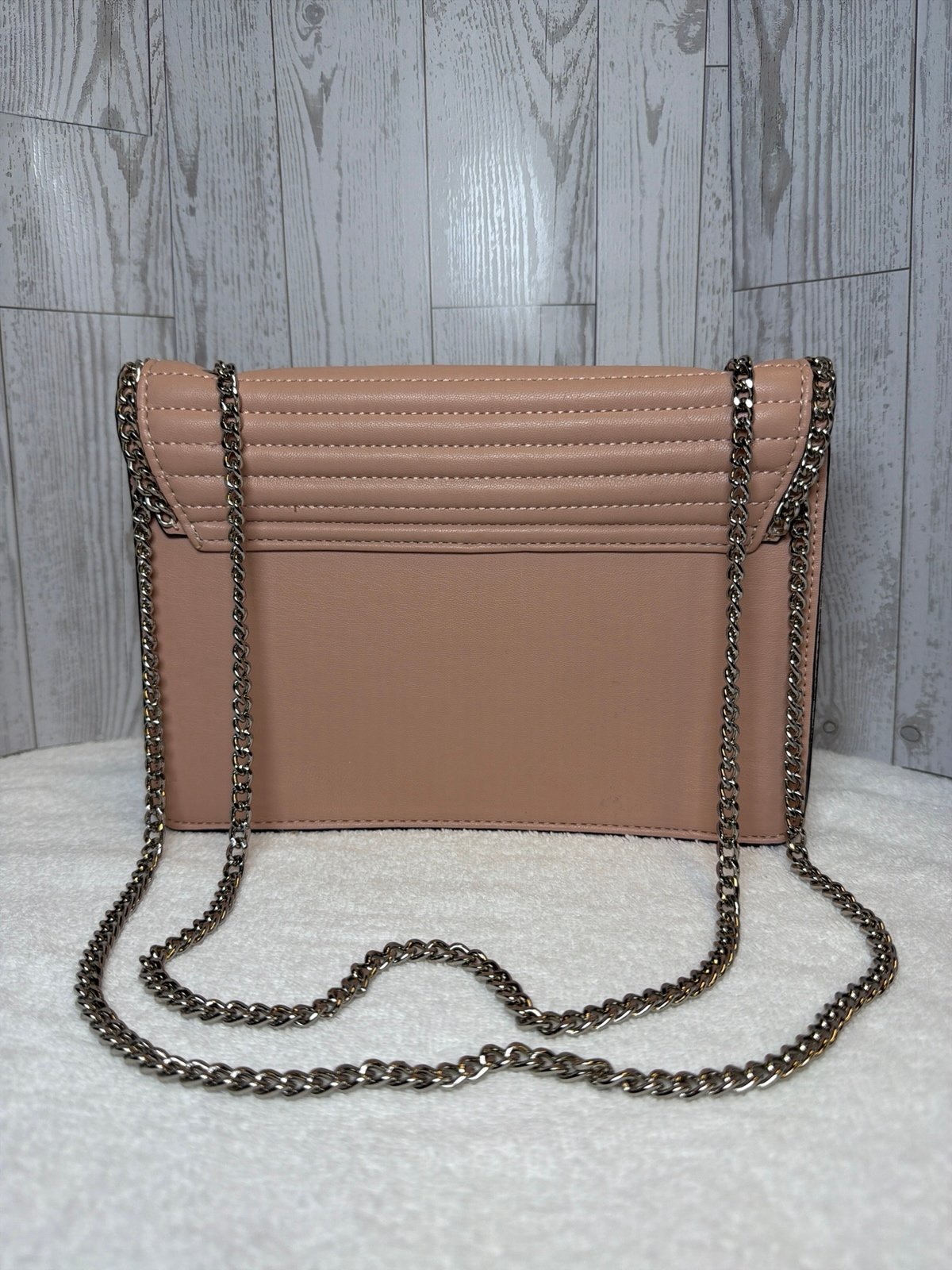 Chic and versatile Express shoulder bag in a soft blush-nude faux leather with edgy silver chain detailing around the edges and matching chain straps. Perfect for elevating day or night outfits — think date night, brunch, or cocktail hour.