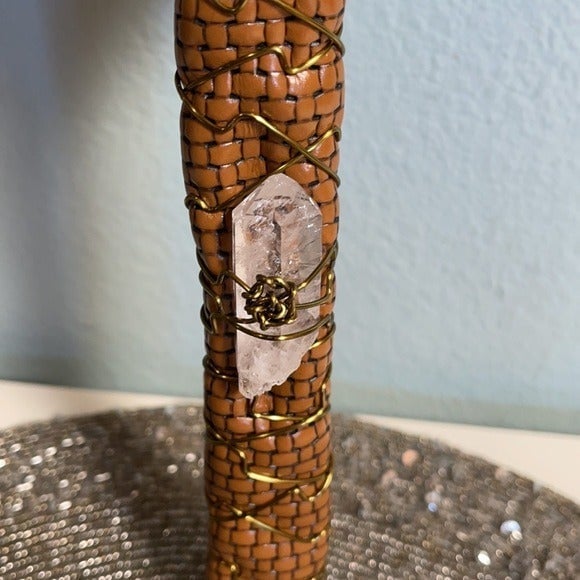 Beautifully handcrafted smudge wand. Made with all natural feathers, including ostrich, pheasant, and goose feathers. Textured brown leather handle. Antique brass colored wire wrapping to secure the all natural clear quartz crystal and amplify intentions.